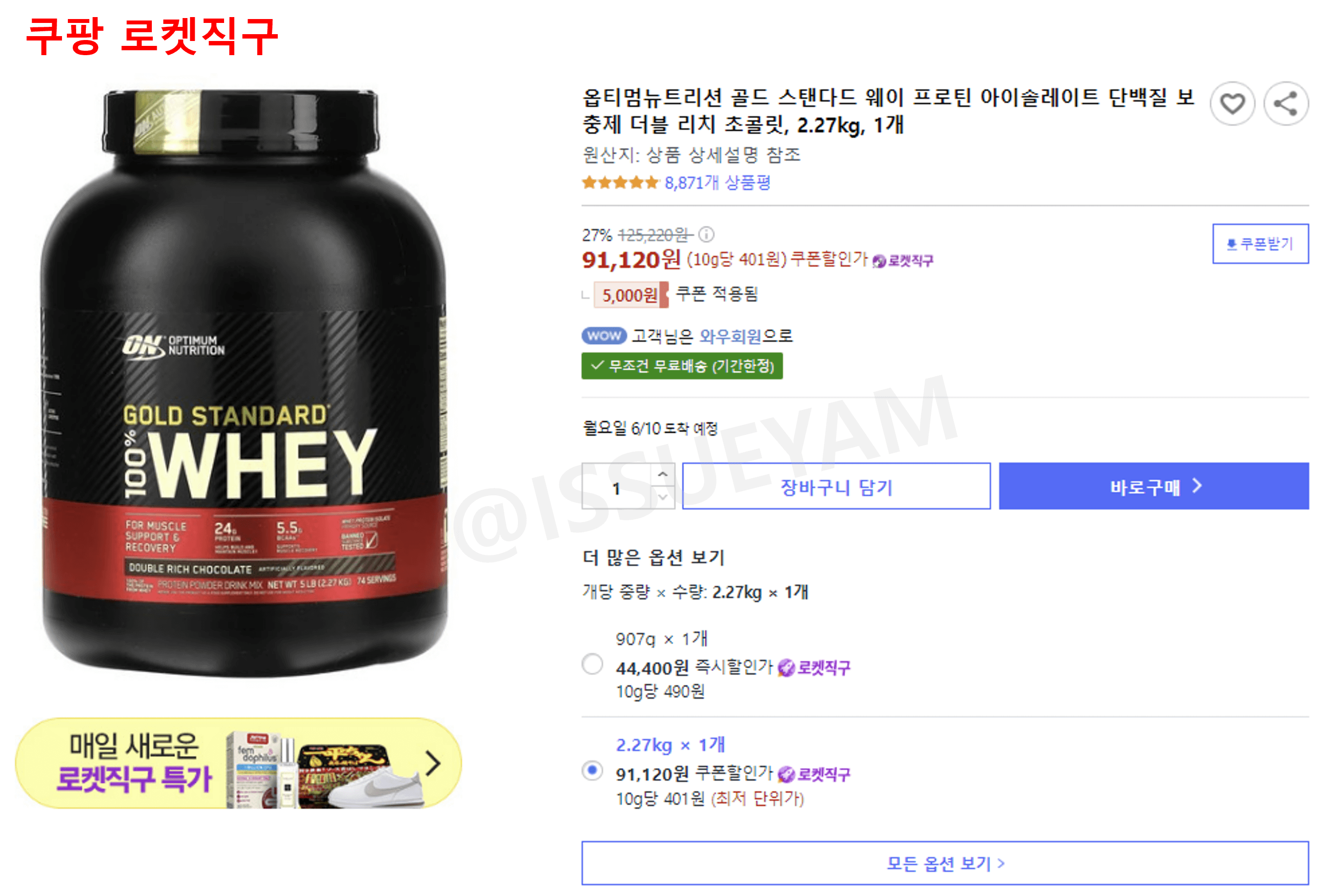 옵티멈뉴트리션 골드 스탠다드 웨이 초콜릿맛은 쿠팡에서 로켓직구로 구매 가능해요. 한국 공식 사이트에서는 2.27kg 구매 시 119,800원인데, 쿠팡에서 구매하면 91,120원으로 구매하실 수 있어요. 거의 미국에서 사는 것과 비슷한 가격이네요.