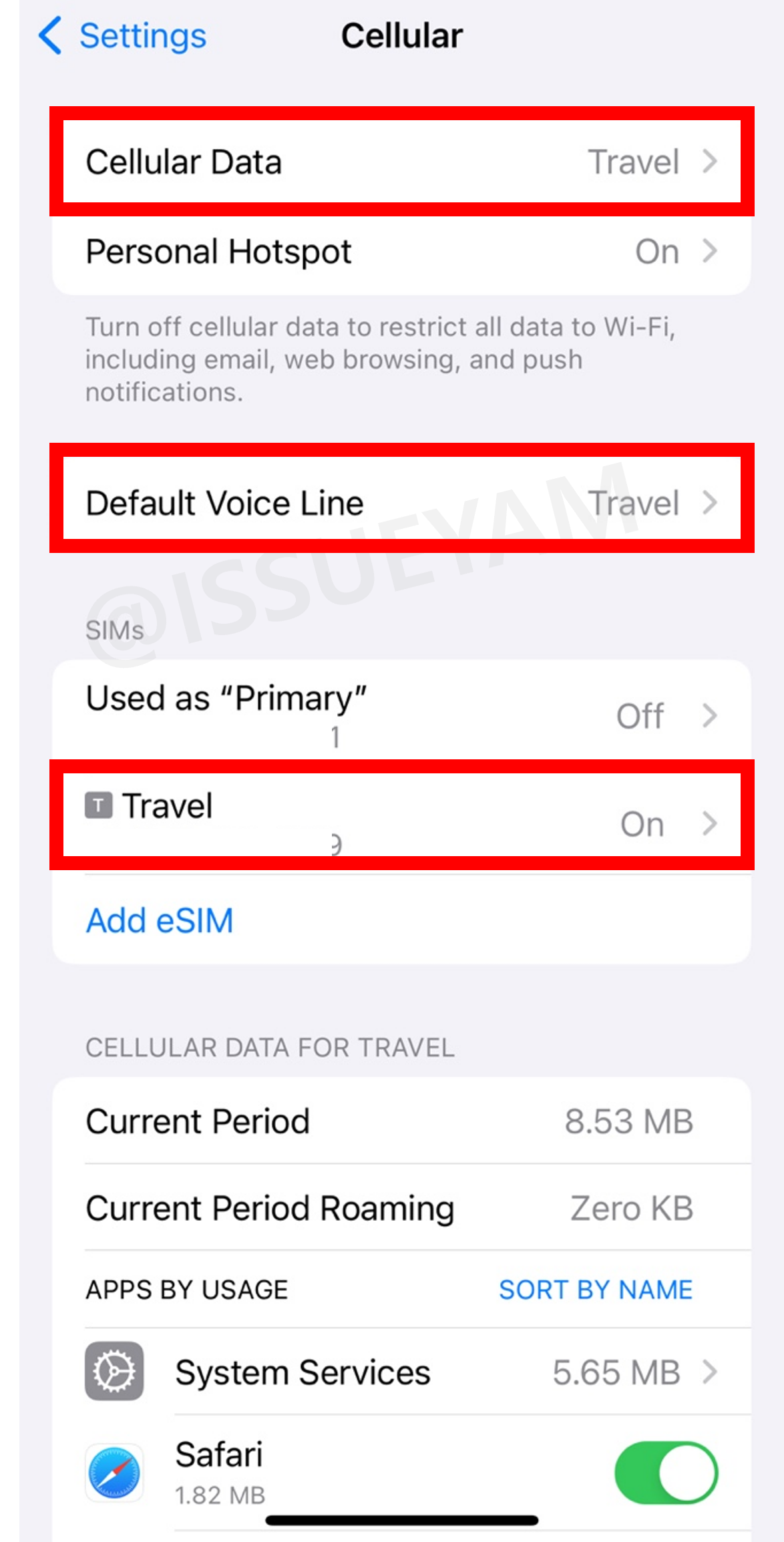 그리고, 핸드폰 화면에서 eSIM을 설치해 주세요. 세팅에서 기존에 있는 심은 OFF 해주고 새로 설치한 eSIM만 ON해두시면 됩니다. 저는 새로운 eSIM 이름을 Travel로 설정해 뒀는데요. 아래와 같이 설정하시면 됩니다.