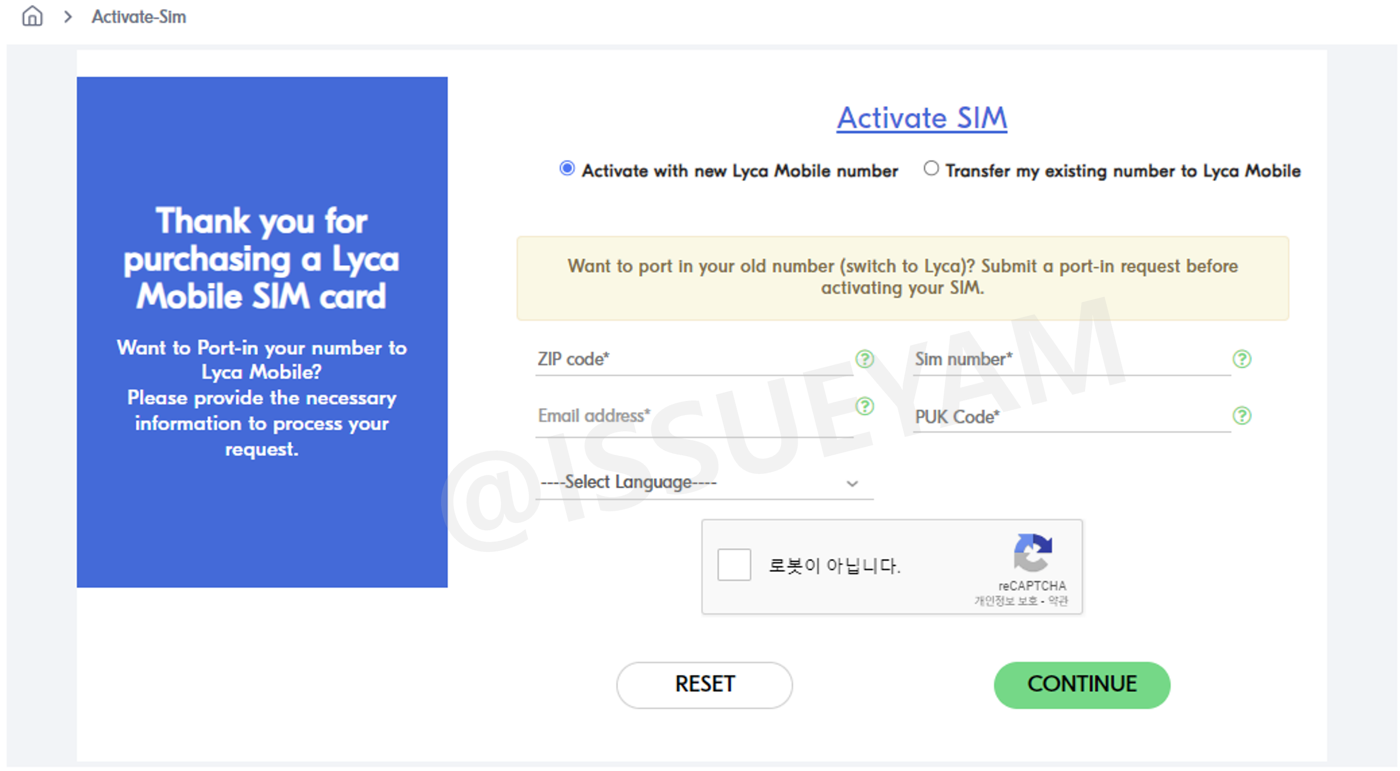 먼저, 라이카모바일 사이트에서 [Activate Sim]에서 [I WANT TO ONLY ACTIVATE MY LYCA SIM]을 클릭합니다.