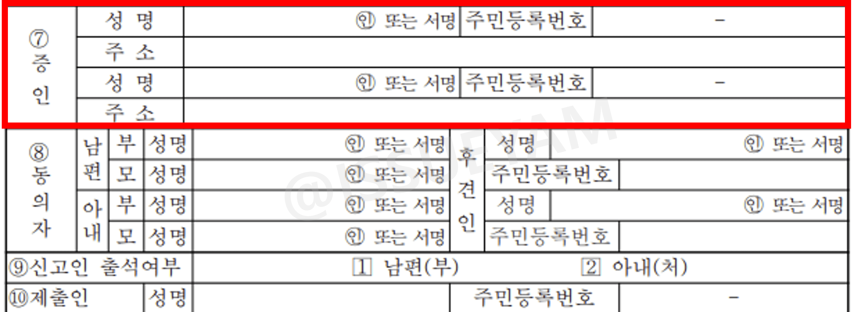 ⑧동의자는 미성년자가 결혼하는 경우에 작성하는 것이기 때문에 생략합니다.
