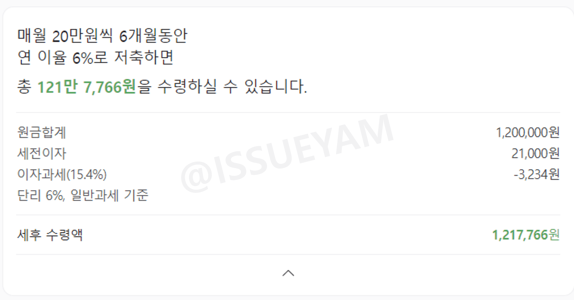 마지막 6개월 미사용 우대금리 조건을 충족하지 못했을 경우, 연 6% 금리를 적용하면 만기 후 금액은 세후 1,217,766원이 됩니다.